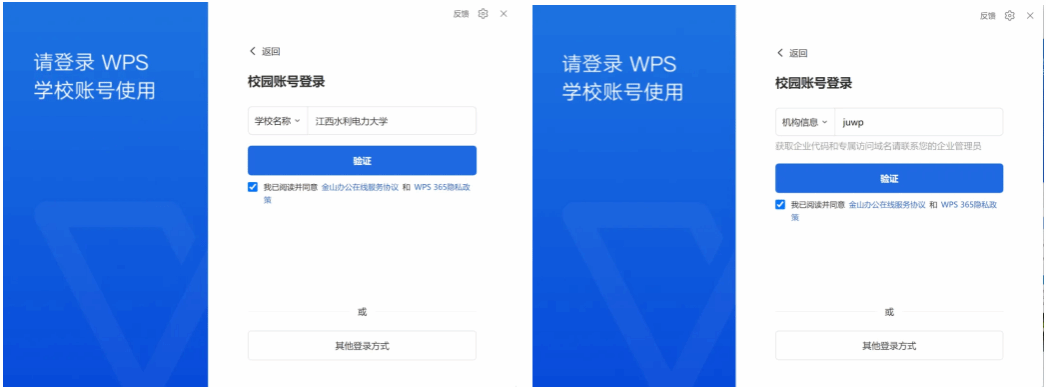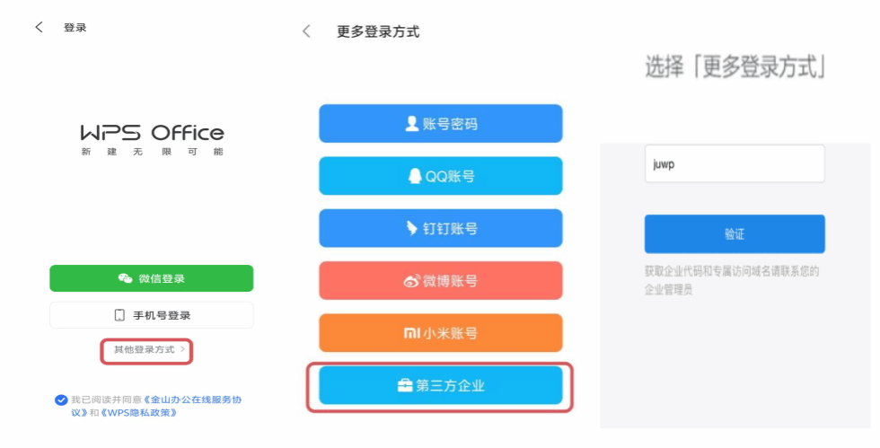 手机端:打开WPS Office客户端,选择“更多登录方式”-“第三方企业”,输入“juwp”,点击验证跳转到统一身份认证登录页面,登录学校账号即可。